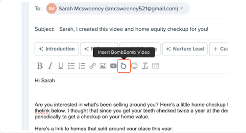 5. Click on Insert BombBomb Video right after the “Hi [client’s first name]”, and before the rest of the email’s text.